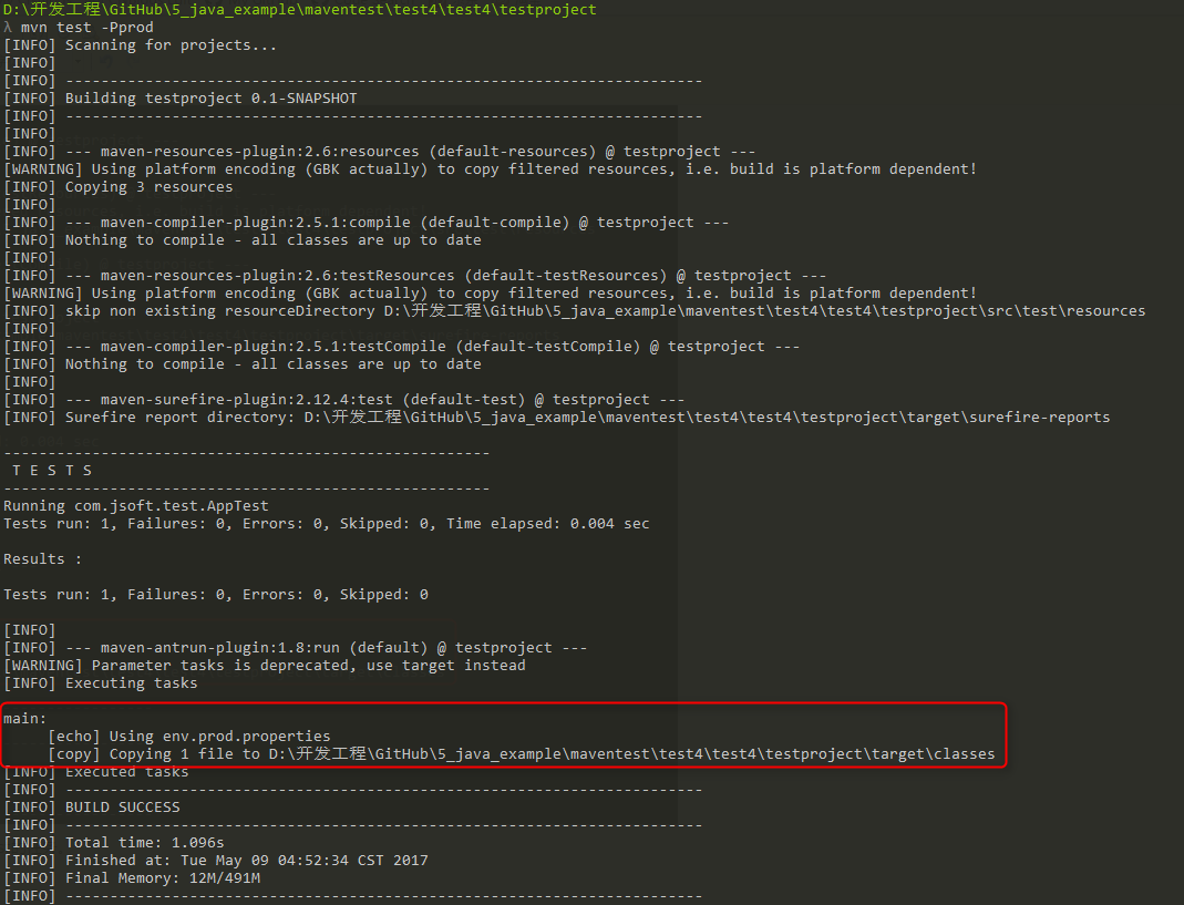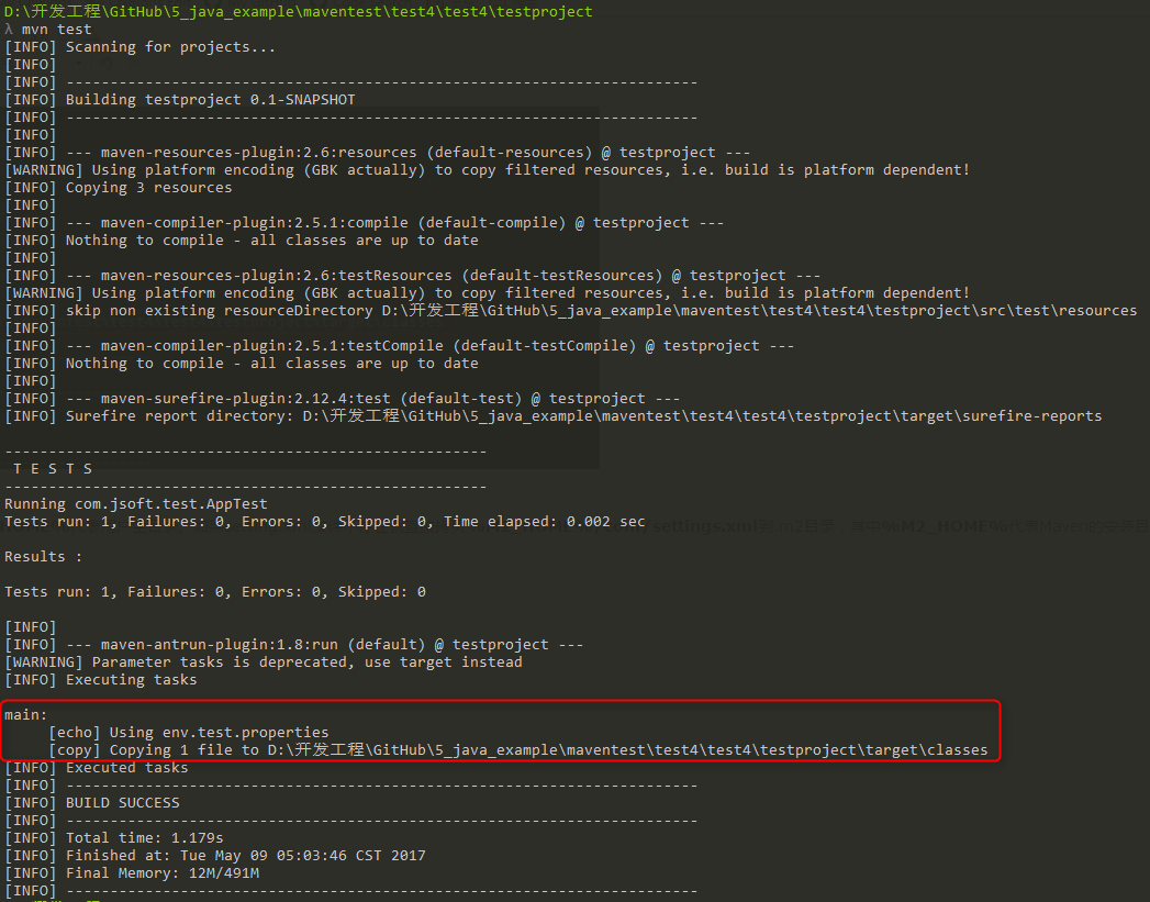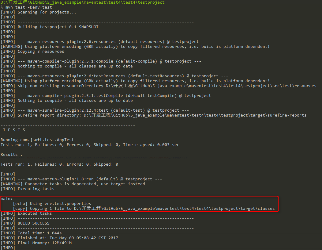 <copy file="src/main/resources/env.test.properties" tofile="${project.build.outputdirectory}/env.properties" overwrite="true"/>