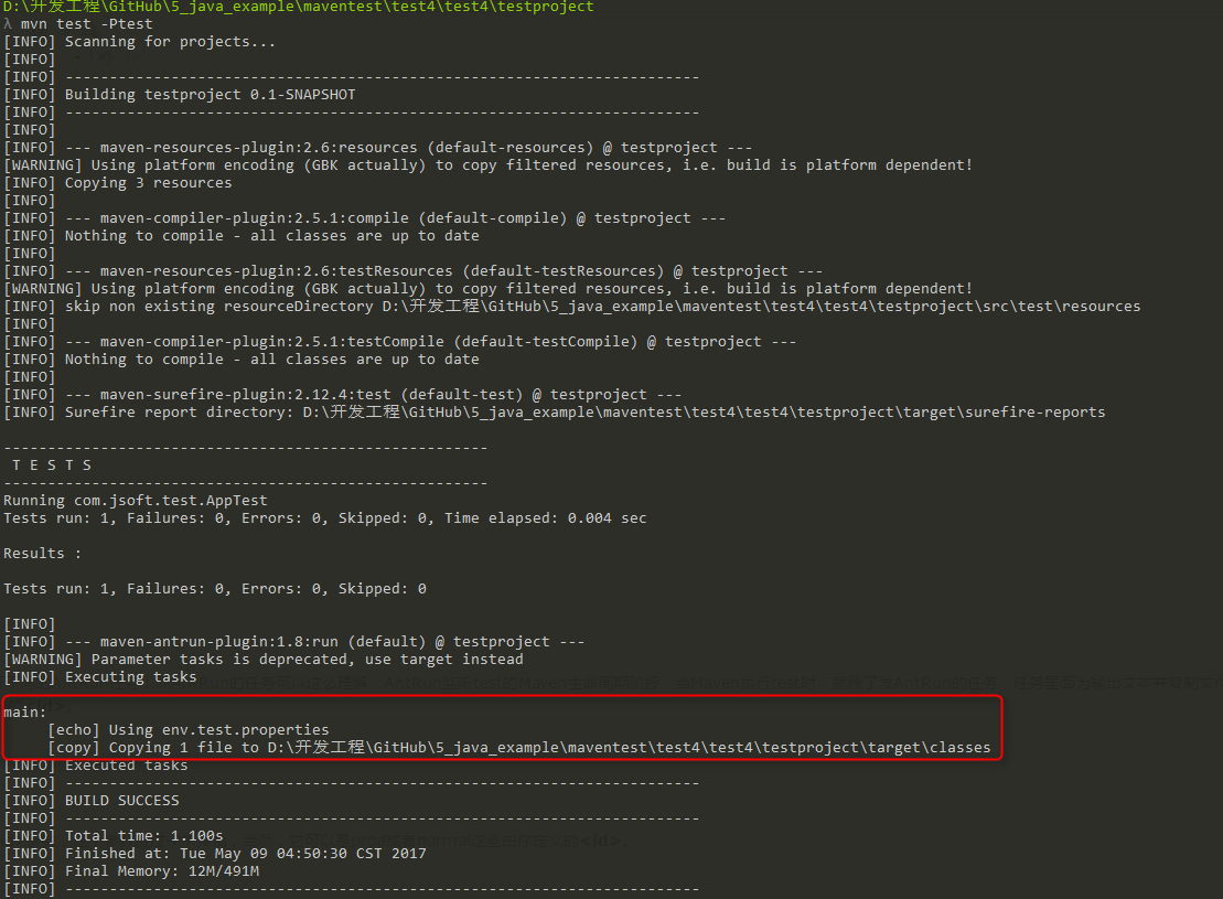 可以看出成功的触发了antrun的任务。并且是对应构建配置文件下的 <id> 为 test 的任务。